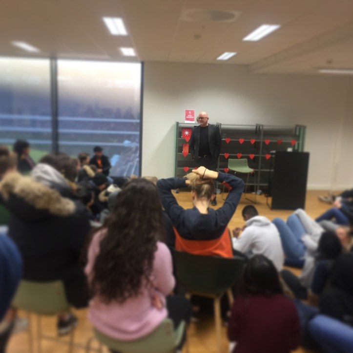 Dag Larsen, utdanningsleder ved NBI og initiativtaker til samarbeidet, introduserte prosjektet for elevene i skolebiblioteket i formiddag. Det var flere elever som ble nysgjerrige, og som begynte å tenke på hvordan de ser for seg fremtiden. Vi ser fram til å lese tekstene deres og er helt sikre på at de elevene som er så heldige å vinne konkurransen, vil få et godt utbytte av skrivekurset. Det hadde jo vært fantastisk om noen av dem blir forfattere i fremtiden!