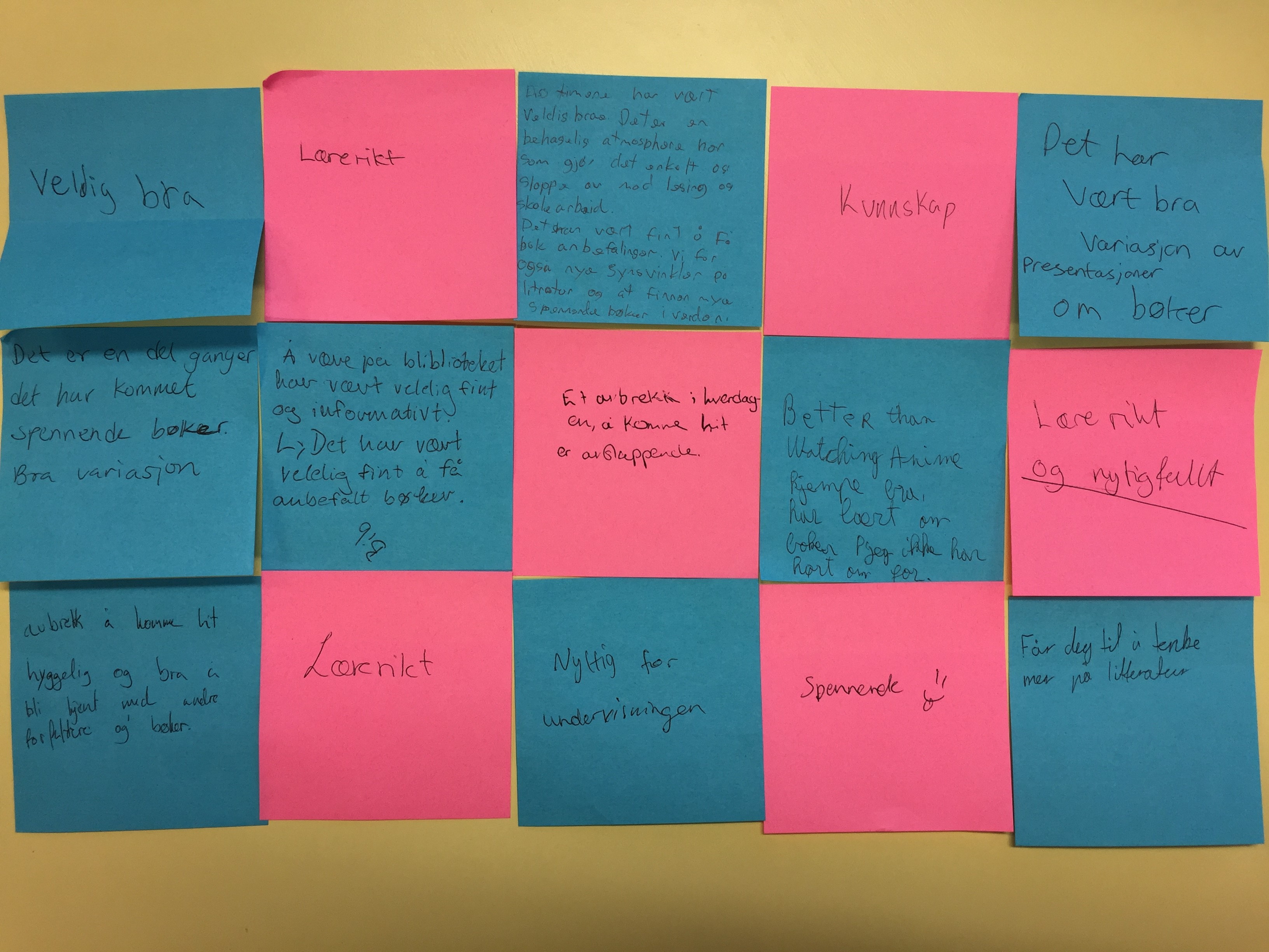 «Disse timene i biblioteket har vært veldig brae. Det er en behagelig atmosfære her som gjør det enkelt å slappe av med lesing og skolearbeid. Det har vært fint å få bokanbefalinger. Vi får også nye synsvinkler på litteratur og at det finnes mye spennende bøker i verden.»