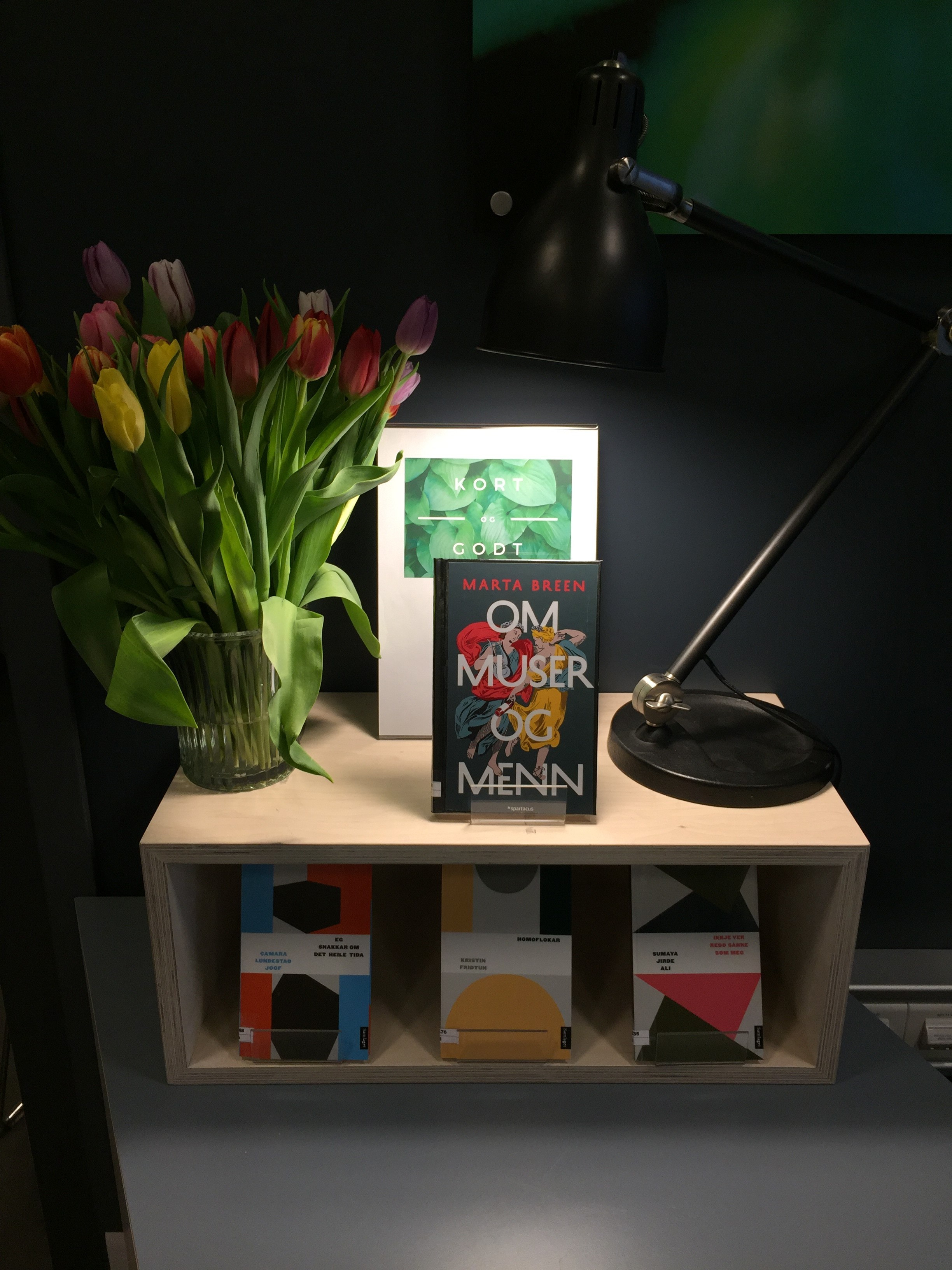 Når man får inn nye bøker er det viktig å vise dem fram og vekke interessen til lånerne. Mitt førsteinntrykk er at det er litt dårlig plass til å lage utstillinger her. Derfor har vi gjort noen grep for å eksponere de nye innkjøpene våre bedre. Skrankepartiet til skolebiblioteket er et blikkfang når man kommer inn på Solli Plass (som læringssenteret vårt heter). Der har vi fått tulipaner, bedre belysning og plass til korte og gode bøker som – bokstavelig talt – må fram i lyset.
