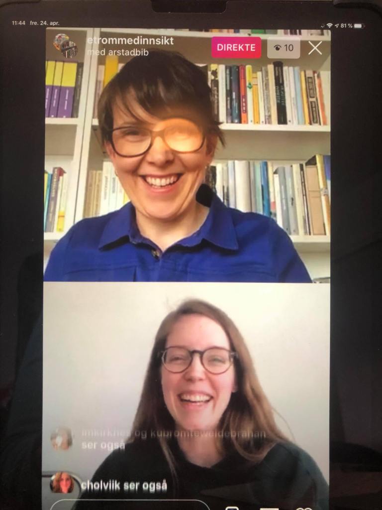 Før påske opprettet jeg instagramkontoen @etrommedinnsikt for å kunne formidle litteratur til elevene mine. Hele denne uka har jeg, med utgangspunkt i prosjektet til norsk vg2 Kreativ, anbefalt klassikere for følgerene mine. I den forbindelse kom jeg på at jeg ville prøve å lage en direktesending på Instagram. Jeg tok kontakt med min skolebibliotekar-kollega Sunniva Relling Berg ved Årstad videregående skole i Bergen. Hun er drivende dyktig, og jeg har fulgt arbeidet i skolebiblioteket deres med stor interesse på Instagram gjennom kontoen @arstadbib. Jeg avtalte et møte med Sunniva og spurte om hun kunne tenke seg å være med på en direktesending på Instagram for å snakke om klassikere. Det fikk vi til, og det var veldig morsomt og hyggelig å se at mange var innom og så på oss. Arrangementet kalte vi Litteratur i lunsjen.