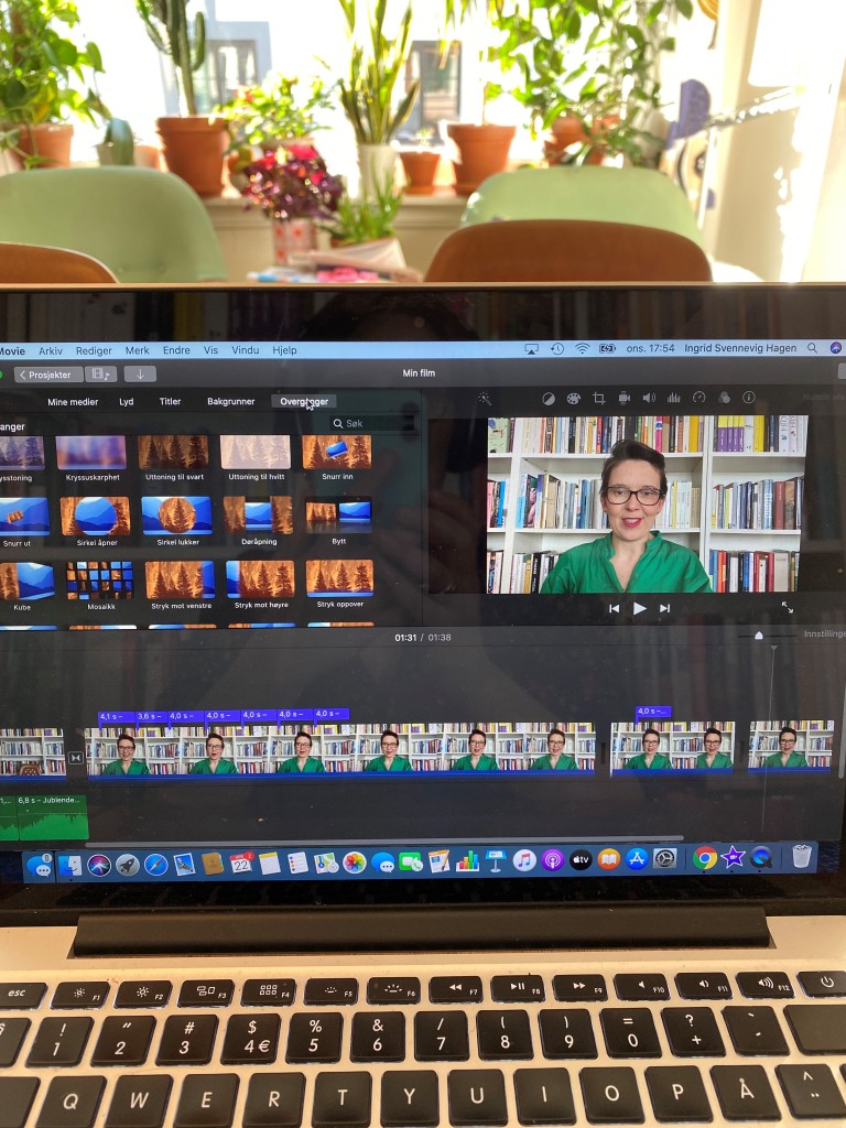 Til slutt vil jeg bare si at det ligger mye jobb bak alle deler av denne prosessen: Å skrive manus til filmen, lese seg opp på temaet man skal formidle, lage studio hjemme i stua med de hjelpemidlene man har for hånden, filme seg selv (det er fortsatt skikkelig flaut), og jeg klarer aldri å filme alt i en tagning, redigere filmen, legge inn overganger, tekst, bilder, lyd, laste opp filmen til Vimeo, planleggingsmøte for å bli enige om samtalens gang på direktesending, markedsføring og sist, men ikke minst nerver.