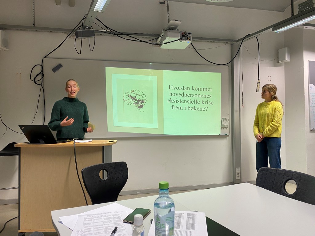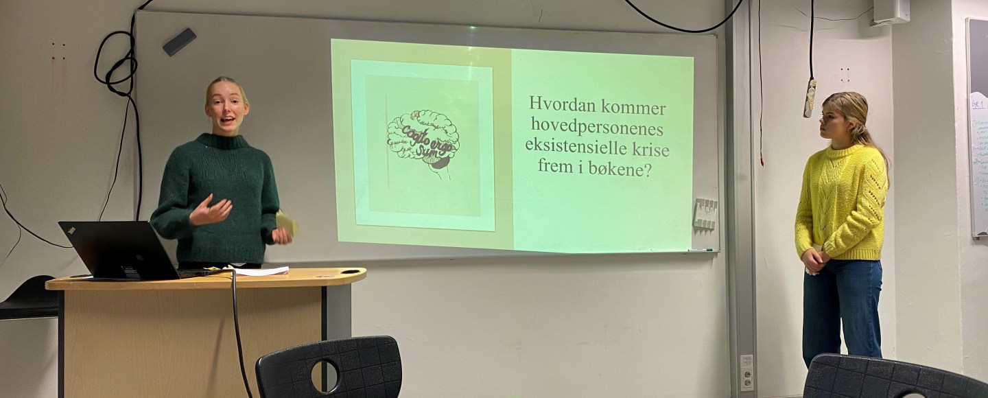 Hedda og Jenny presenterte en komparativ analyse av romanene Jo fortere jeg går, jo mindre er jeg av Kjersti Annesdatter Skomsvold og Skilpadder hele veien ned av John Green. Faglærer Ingvild Mjøset Bogen og undertegnede var publikum.