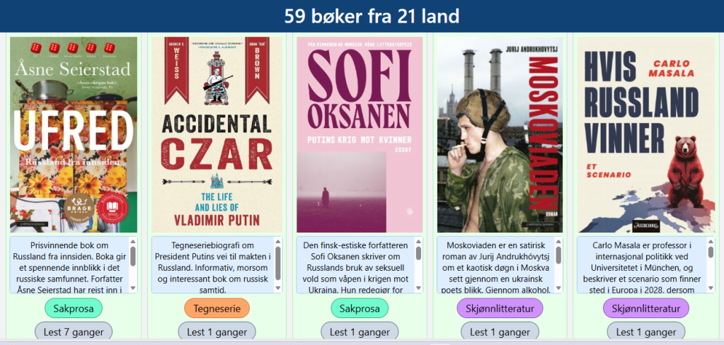 Hvis du vil lese en bok fra/om Russland, kan du klikke på landet, enten på kartet, eller på listen over land. Så får du en oversikt over bøker som er lest, hvilken sjanger bøkene tilhører, en liten anbefaling skrevet av elevene og du kan se hvor mange som har lest boka.