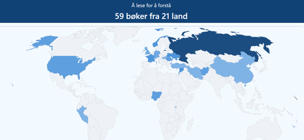 «Å lese for å forstå» er årets store leseprosjekt i skolebiblioteket for elever i politikk og menneskerettigheter. Gjennom hele året skal elevene lese bøker i forskjellige sjangre, fra hele verden. Nå er prosjektet godt i gang og jeg er stolt over å kunne presentere verdenskartet jeg har fått laget for å synliggjøre den geografiske spredningen i hvor bøkene kommer fra.